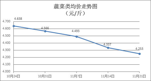 蔬菜类商品价格普遍下降。本周所监测的32 种蔬菜商品价格波动情况为5涨23跌4平,综合零售均价为4.253元/斤,环比下降1.94%。其中:涨幅居前的品种包括水空心菜、黄瓜、土豆,零售均价分别为每斤3.70元、3.87元、3.28元,环比分别上涨2.78%、2.65%、2.18%;跌幅居前的品种包括生菜、花菜、西红柿,零售均价分别为每斤3.27元、4.16元、4.52元,环比分别下降7.63%、7.56%、7.00%。