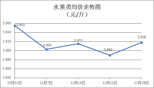水果类商品价格小幅上涨。本周所监测的6种水果商品价格波动情况为5涨1平,综合零售均价为5.918元/斤,环比上涨0.48%。其中橙子、葡萄、梨零售均价分别为每斤6.37元、11.56元、4.87元,环比分别上涨0.63%、上涨0.61%、上涨0.41%。