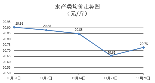 水产类商品价格窄幅盘整。本周所监测的10种水产商品价格波动情况为6涨3跌1平,综合均价为20.73元/斤,环比上涨0.35%。其中:草鱼、鳙鱼、罗非鱼、基围虾零售均价分别为每斤11.29元、10.88元、8.71元、37.53元,环比分别下降1.22%、上涨0.09%、上涨1.75%、上涨0.29%。