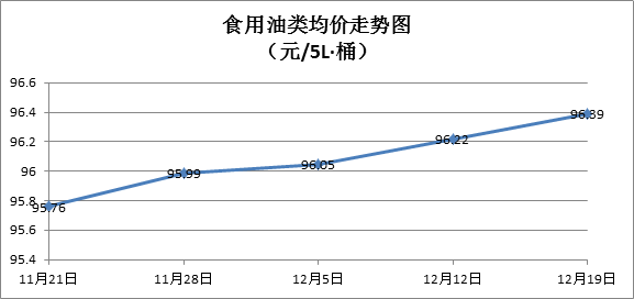 食用油类商品价格稳中微涨。本周所监测的9种食用油(5L装)商品价格波动情况为3涨1跌5平,综合零售均价为96.39元/桶,环比上涨0.18%。其中:鲁花花生油、玉米油零售均价分别为每桶160.58元、74.96元,环比分别上涨0.84%、上涨0.19%。