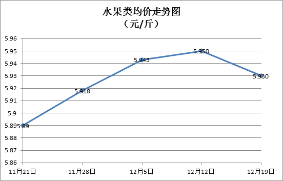 水果类商品价格小幅盘整。本周所监测的6种水果商品价格波动情况为2涨3跌1平,综合零售均价为5.930元/斤,环比下降0.34%。其中橙子、苹果、葡萄零售均价分别为每斤6.20元、6.92元、11.92元,环比分别下降0.80%、下降0.86%、持平。