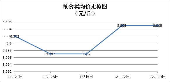 粮食类商品价格平稳。本周所监测的6种粮食商品价格平稳,综合零售均价为3.305元/斤,环比持平。其中:晚籼米、丝苗米、富强粉零售均价分别为每斤3.31元、3.53元、3.38元,环比均持平。