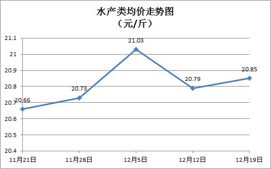 水产类商品价格稳中微涨。本周所监测的10种水产商品价格波动情况为5涨4跌1平,综合均价为20.85元/斤,环比上涨0.30%。其中:草鱼、鲫鱼、罗非鱼、基围虾零售均价分别为每斤11.43元、14.28元、8.74元、38.72元,环比分别上涨0.35%、上涨1.28%、上涨0.11%、上涨2.08%。