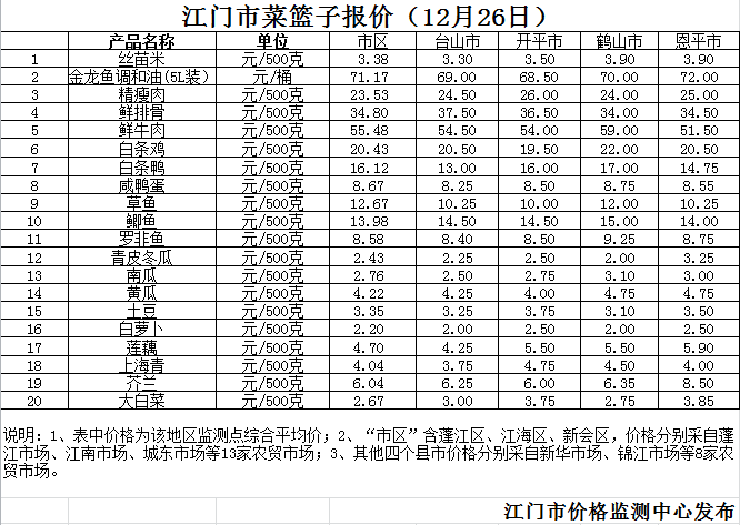 据本市21家农贸市场监测数据显示,本周(2022年12月20日至12月26日,下同)市场上各类“菜篮子”商品供应充足,所监测的7大类“菜篮子”商品价格3涨3跌1平。其中:粮油类商品价格基本平稳,肉类、水产类商品价格窄幅盘整,禽蛋类、蔬果类商品价格总体略涨。