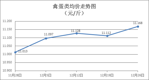 禽蛋类商品价格微幅上涨。本周所监测的6种禽蛋类商品价格波动情况为4涨2平,综合零售均价为11.168元/斤,环比上涨0.51%。其中:白条鸡、白条鸭零售均价分别为每斤20.54元、15.59元,环比分别上涨0.64%、持平;白壳鸡蛋、鸭蛋零售均价分别为每斤7.31元、7.81元,环比分别上涨0.83%、上涨0.26%。
