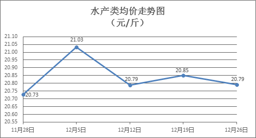 水产类商品价格总体略降。本周所监测的10种水产商品价格波动情况为4涨3跌3平,综合均价为20.79元/斤,环比下降0.29%。其中:草鱼、鳙鱼、罗非鱼、基围虾零售均价分别为每斤11.50元、10.81元、8.66元、37.88元,环比分别上涨0.61%、下降0.64%、下降0.92%、下降2.17%。