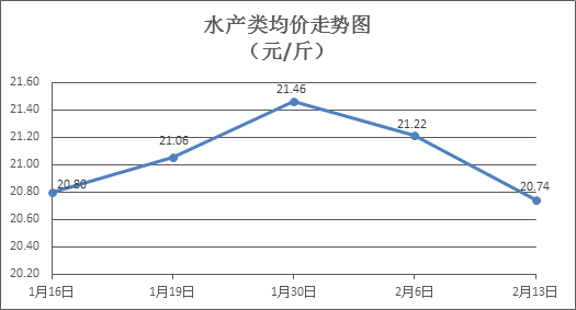 水产类商品价格有所下降。本周所监测的10种水产商品价格波动情况为1平9跌,综合均价为20.74元/斤,环比下降2.23%。其中:草鱼、鲫鱼、鲈鱼、基围虾零售均价分别为每斤11.32元、14.06元、19.57元、38.63元,环比分别下降1.22%、下降2.97%、下降2.15%、下降4.45%。