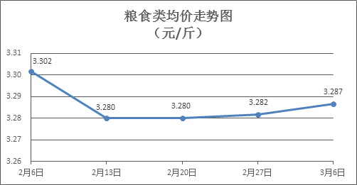 粮食类商品价格稳中微涨。本周所监测的6种粮食商品价格波动情况为2涨4平,综合零售均价为3.287元/斤,环比上涨0.15%。其中:晚籼米、丝苗米、标准粉零售均价分别为每斤3.26元、3.44元、3.14元,环比分别持平、上涨0.29%、上涨0.64%。