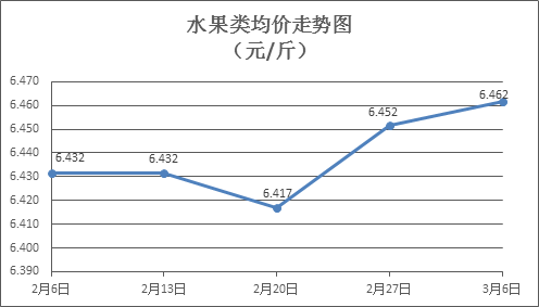 水果类商品价格窄幅波动。本周所监测的6种水果商品价格波动情况为2涨2跌2平,综合零售均价为6.462元/斤,环比上涨0.15%。其中苹果、香蕉、葡萄零售均价分别为每斤7.11元、3.12元、12.87元,环比分别下降0.56%、持平、上涨1.34%。