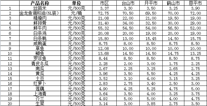 说明:1、表中价格为该地区监测点综合平均价;2、“市区”含蓬江区、江海区、新会区,价格分别采自蓬江市场、江南市场、城东市场等13家农贸市场;3、其他四个县市价格分别采自新华市场、锦江市场等8家农贸市场。