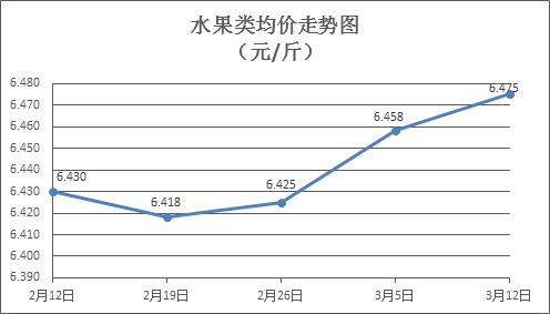 水果类商品价格总体微涨。本周所监测的6种水果商品价格波动情况为3涨2跌1平,综合零售均价为6.475元/斤,环比上涨0.26%。其中苹果、香蕉、梨零售均价分别为每斤7.13元、3.12元、6.01元,环比分别下降0.14%、持平、上涨0.84%。