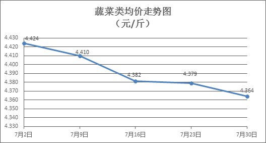 据本市21家农贸市场监测数据显示,上周(7月24日至7月30日,下同)市场上各类“菜篮子”商品供应充足,所监测的7大类“菜篮子”商品价格6跌1平。其中:粮食类商品价格保持稳定,食用油类、肉禽蛋类、蔬果类、水产类商品价格总体略降。受台风天气影响,预计近期部分蔬菜类商品供应减少价格上涨,其他商品价格窄幅盘整。