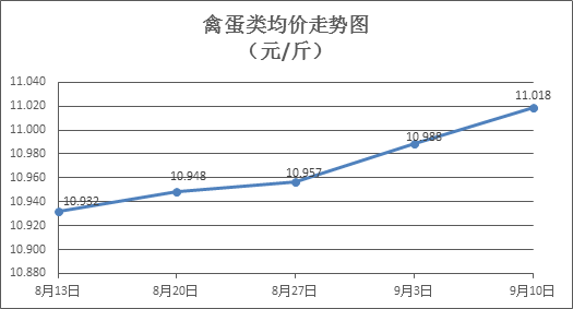 禽蛋类商品价格小幅略涨。上周所监测的6种禽蛋类商品价格波动情况为4涨1跌1平,综合零售均价为11.018元/斤,环比上涨0.27%。其中:白条鸡、白条鸭零售均价分别为每斤19.59元、15.75元,环比分别下降0.15%、上涨0.45%;白壳鸡蛋、鸭蛋零售均价分别为每斤6.83元、7.93元,环比分别上涨0.89%、持平。