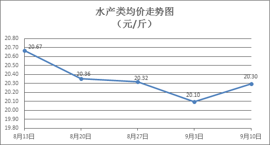 水产类商品价格小幅回升。上周所监测的10种水产商品价格波动情况为9涨1跌,综合均价为20.30元/斤,环比上涨0.99%。其中:草鱼、鲢鱼、鳙鱼、罗非鱼、基围虾零售均价分别为每斤11.05元、9.92元、10.21元、8.38元、35.53元,环比分别上涨0.82%、持平、上涨1.09%、上涨1.09%、上涨0.45%。