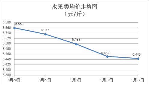 水果类商品价格微幅波动。上周所监测的6种水果商品价格波动情况为2涨3跌1平,综合零售均价为6.443元/斤,环比下降0.13%。其中橙子、香蕉、葡萄零售均价分别为每斤6.42元、3.04元、12.90元,环比分别上涨0.94%、下降0.33%、下降0.77%。