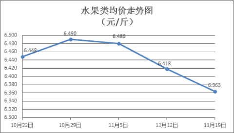 水果类商品价格普遍下降。上周所监测的6种水果商品价格波动情况为5跌1平,综合零售均价为6.363元/斤,环比下降0.86%。其中苹果、香蕉、葡萄零售均价分别为每斤7.27元、3.03元、12.78元,环比分别下降0.27%、下降0.33%、下降0.39%。