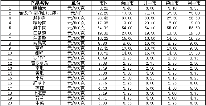 说明:1、表中价格为该地区监测点综合平均价;2、“市区”含蓬江区、江海区、新会区,价格分别采自蓬江市场、江南市场、城东市场等13家农贸市场;3、其他四个县市价格分别采自新华市场、锦江市场等8家农贸市场。