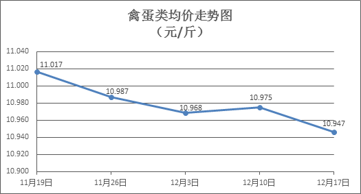 禽蛋类商品价格略有下降。上周所监测的6种禽蛋类商品价格波动情况为1涨4跌1平,综合零售均价为10.947元/斤,环比下降0.26%。其中:白条鸡、白条鸭零售均价分别为每斤19.59元、15.37元,环比分别下降0.41%、上涨0.07%;白壳鸡蛋、鸭蛋零售均价分别为每斤6.78元、8.04元,环比分别下降0.29%、下降0.25%。