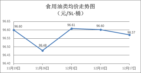 食用油类商品价格稳中略降。上周所监测的9种食用油(5L装)商品价格波动情况为1涨5跌3平,综合零售均价为96.57元/桶,环比下降0.03%。其中:鲁花花生油、玉米油零售均价分别为每桶157.13元、74.68元,环比分别下降0.04%、下降0.11%。