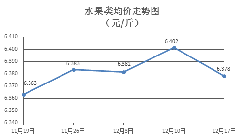 水果类商品价格总体略降。上周所监测的6种水果商品价格波动情况为2涨3跌1平,综合零售均价为6.378元/斤,环比下降0.36%。其中苹果、香蕉、葡萄零售均价分别为每斤7.27元、2.96元、13.12元,环比分别下降0.95%、下降0.67%、上涨0.69%。