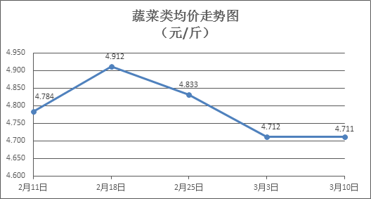 蔬菜类商品价格升降互现。上周所监测的32 种蔬菜商品价格波动情况为12涨19跌1平,综合零售均价为4.711元/斤,环比下降0.02%。其中:涨幅居前的品种包括青皮冬瓜、本地菜心、花菜,零售均价分别为每斤2.70元、5.11元、3.84元,环比分别上涨6.30%、5.80%、3.50%;跌幅靠前的品种包括青豆角、土豆、西红柿,零售均价分别为每斤6.75元、3.13元、3.82元,环比分别下降5.06%、下降3.10%、下降3.05%。