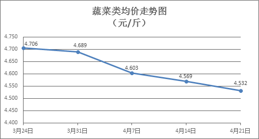 蔬菜类商品价格降多涨少。所监测的32 种蔬菜商品价格波动情况为9涨21跌2平,综合零售均价为每斤4.532元,环比下降0.81%。其中:涨幅居前的品种包括芥兰、西红柿、上海青,零售均价分别为每斤5.34元、3.77元、3.63元,环比分别上涨4.50%、4.43%、3.42%;跌幅靠前的品种包括苦瓜、丝瓜、西洋菜,零售均价分别为每斤5.40元、5.13元、3.44元,环比分别下降8.01%、4.82%、3.91%。