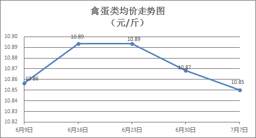 禽蛋类商品价格持续下调。所监测的6种禽蛋类商品价格波动情况为2涨3跌1平,综合零售均价为每斤10.85元,环比下降0.18%。其中:白条鸡、白条鸭零售均价分别为每斤20.11元、15.01元,环比分别下降0.40%、下降0.20%;白壳鸡蛋、咸鸭蛋零售均价分别为每斤6.31元、8.96元,环比分别上涨0.32%、下降0.44%。