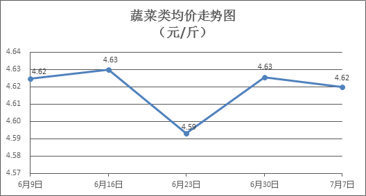 蔬菜类商品价格升降互现。所监测的32 种蔬菜商品价格波动情况为13涨16跌3平,综合零售均价为每斤4.62元,环比下降0.06%。其中:涨幅居前的品种包括黄瓜、花菜、白苋菜,零售均价分别为每斤4.06元、4.79元、4.35元,环比分别上涨7.12%、5.74%、1.40%;跌幅靠前的品种包括苦瓜、西红柿、丝瓜,零售均价分别为每斤4.79元、4.11元、4.83元,环比分别下降6.63%、3.97%、2.42%。