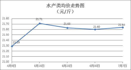 水产类商品价格有所微涨。所监测的10种水产商品价格波动情况为4涨3跌3平,综合均价为每斤21.64元,环比上涨0.16%。其中:草鱼、鲫鱼、鲈鱼、罗非鱼、基围虾零售均价分别为每斤11.17元、14.30元、21.60元、8.85元、30.29元,环比分别上涨0.09%、下降0.14%、上涨0.98%、上涨0.11%、下降0.33%。