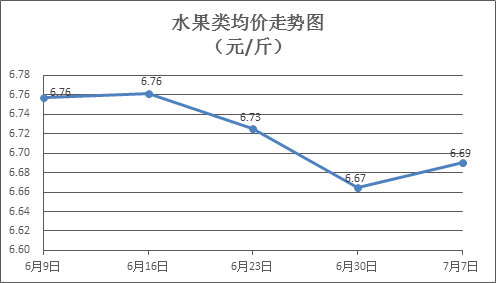 水果类商品价格有所上涨。所监测的6种水果商品价格波动情况为3涨2跌1平,综合零售均价为每斤6.69元,环比上涨0.43%。其中橙子、苹果、香蕉零售均价分别为每斤5.64元、7.49元、2.94元,环比分别上涨0.36%、上涨0.13%、下降1.01%。