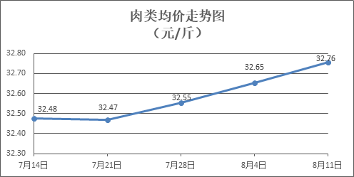 肉类商品价格总体略涨。所监测的8种肉类商品价格波动情况为5涨3跌,综合零售均价为每斤32.76元,环比上涨0.31%。其中:排骨、精瘦肉、牛肉、带骨羊肉零售均价分别为每斤32.22元、19.81元、45.42元、43.35元,环比分别上涨1.23%、上涨1.02%、下降0.31%、下降0.05%。