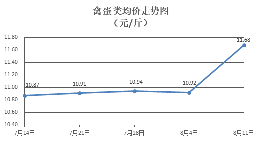 禽蛋类商品价格略有上涨。所监测的5种禽蛋类商品价格波动情况为3涨1跌1平,综合零售均价为每斤11.68元,环比上涨0.29%。其中:白条鸡、白条鸭零售均价分别为每斤20.01元、15.19元,环比分别上涨0.30%、上涨0.40%;白壳鸡蛋、鸭蛋零售均价分别为每斤6.52元、7.67元,环比分别下降0.15%、上涨0.79%。