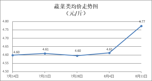 蔬菜类商品价格普遍上涨。所监测的32 种蔬菜商品价格波动情况为27涨3跌2平,综合零售均价为每斤4.77元,环比上涨3.48%。其中:涨幅居前的品种包括苦瓜、丝瓜、莴笋,零售均价分别为每斤5.03元、5.15元、4.40元,环比分别上涨16.98%、15.73%、11.39%;跌幅靠前的品种包括莲藕、土豆、南瓜,零售均价分别为每斤5.99元、3.00元、2.66元,环比分别下降1.96%、1.32%、0.75%。