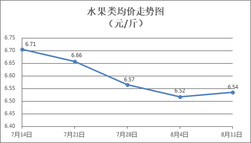 水果类商品价格以涨为主。所监测的6种水果商品价格波动情况为5涨1跌,综合零售均价为每斤6.54元,环比上涨0.28%。其中橙子、葡萄、梨零售均价分别为每斤5.72元、13.77元、5.81元,环比分别上涨1.24%、下降1.15%、上涨0.17%。