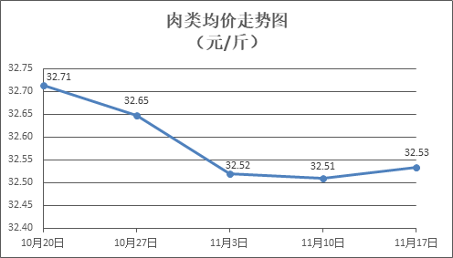 肉类商品价格窄幅盘整。所监测的8种肉类商品价格波动情况为3涨1跌4平,综合零售均价为每斤32.53元,环比上涨0.08%。其中:排骨、精瘦肉、牛肉、带骨羊肉零售均价分别为每斤32.35元、20.05元、45.88元、41.82元,环比分别上涨0.28%、下降0.40%、上涨0.15%、上涨0.31%。