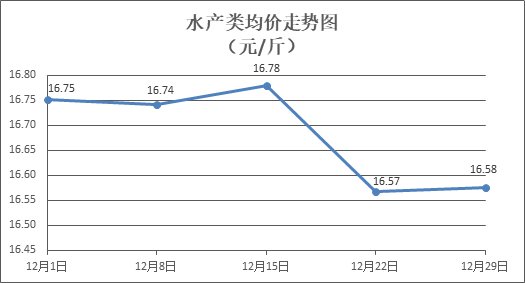 水产类商品价格窄幅盘整。所监测的9种水产商品价格波动情况为3涨5跌1平,综合均价为每斤16.58元,环比上涨0.05%。其中:草鱼、鲫鱼、罗非鱼、鳙鱼、基围虾零售均价分别为每斤11.07元、13.93元、9.11元、10.66元、29.55元,环比分别持平、下降0.43%、下降0.11%、下降0.93%、上涨0.34%。