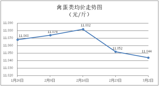 禽蛋类商品价格略有下降。所监测的5种禽蛋类商品价格波动情况为1涨3跌1平,综合零售均价为每斤11.844元,环比下降0.07%。其中:白条鸡、白条鸭零售均价分别为每斤20.56元、15.26元,环比分别下降0.10%、下降0.13%;鸡蛋、鸭蛋零售均价分别为每斤6.59元、7.67元,环比分别下降0.30%、上涨0.26%。
