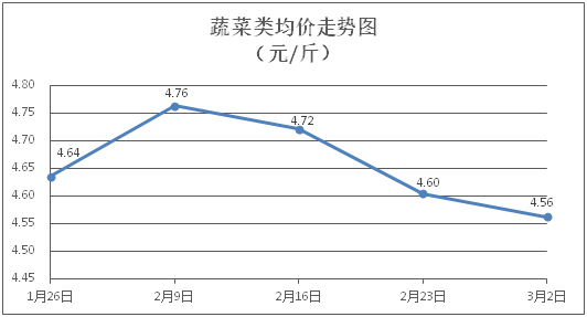 据本市21家农贸市场监测数据显示,上周(2月24日至3月2日)市场上各类“菜篮子”商品供应充足,所监测的7大类“菜篮子”商品价格环比总体表现为1涨4跌2平。其中:粮油类商品价格基本平稳,肉禽蛋类、蔬菜类商品价格总体略降,水果类、水产类价格窄幅盘整。