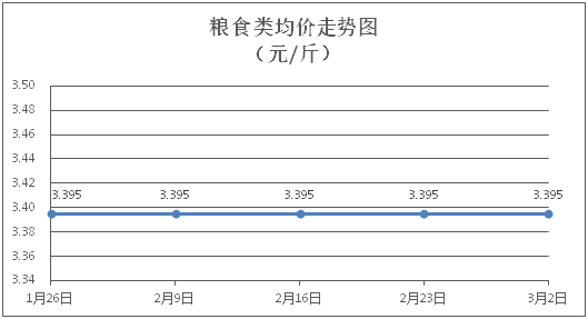 粮食类商品价格保持稳定。所监测的4种粮食类商品价格均持平,综合零售均价为每斤3.395元。其中:丝苗米、面粉零售均价分别为每斤3.54元、3.40元,环比均持平。