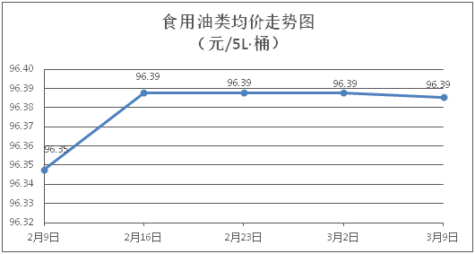 食用油类商品价格基本平稳。所监测的9种食用油(5L装)商品价格波动情况为1跌8平,综合零售均价为每桶96.39元,环比下降0.002%。其中:鲁花花生油、玉米油零售均价为每桶156.04元、76.65元,环比分别持平、下降0.03%。