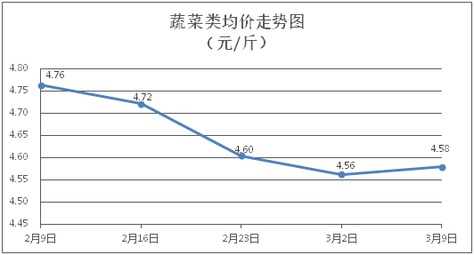 蔬菜类商品价格升降互现。所监测的32 种蔬菜商品价格波动情况为11涨14跌7平,综合零售均价为每斤4.58元,环比上涨0.37%。其中:涨幅居前的品种包括苦瓜、丝瓜、水空心菜,零售均价分别为每斤6.12元、6.48元、5.06元,环比分别上涨12.09%、5.88%、3.27%;跌幅靠前的品种包括西洋菜、蒜苔、莴笋,零售均价分别为每斤3.58元、8.73元、3.51元,环比分别下降3.50%、3.32%、2.23%。