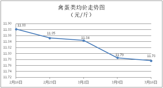禽蛋类商品价格弱势盘整。所监测的5种禽蛋类商品价格波动情况为1涨3跌1平,综合零售均价为每斤11.78元,环比下降0.08%。其中:白条鸡、白条鸭零售均价分别为每斤20.58元、15.19元,环比分别上涨0.59%、下降0.33%;鸡蛋、鸭蛋零售均价分别为每斤6.38元、7.59元,环比分别下降0.78%、下降0.91%。