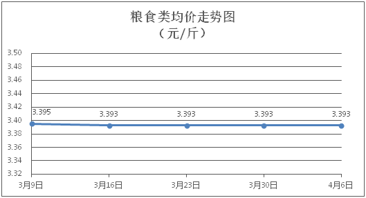 粮食类商品价格保持稳定。所监测的4种粮食类商品价格均持平,综合零售均价为每斤3.393元。其中:丝苗米、面粉零售均价分别为每斤3.53元、3.40元,环比均持平。