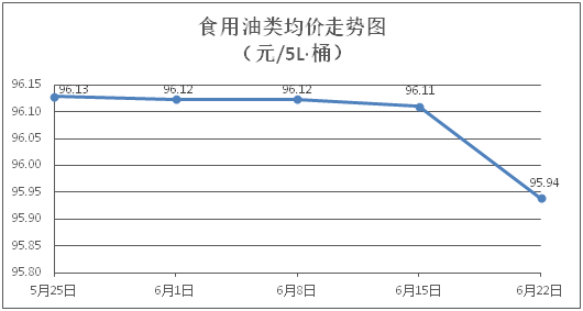食用油类商品价格总体微降。所监测的9种食用油(5L装)商品价格波动情况为3涨5跌1平,综合零售均价为每桶95.94元,环比下降0.18%。其中:大豆油、玉米油零售均价为每桶61.50元、76.19元,环比分别下降0.23%、上涨0.14%。