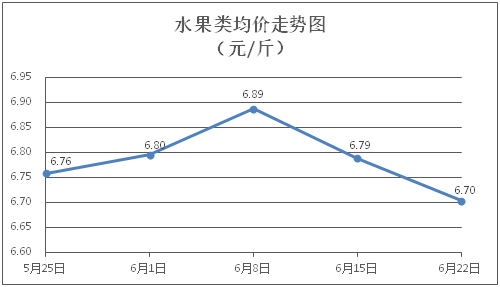 水果类商品价格小幅波动。所监测的6种水果商品价格波动情况为3涨3跌,综合零售均价为每斤6.70元,环比下降1.25%。其中橙子、香蕉、葡萄零售均价分别为每斤6.46元、3.45元、14.00元,环比分别下降0.92%、上涨0.29%、下降3.38%。