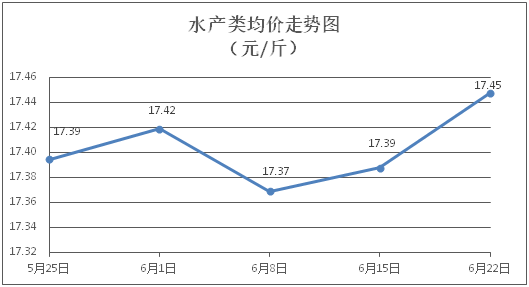 水产类商品价格微幅上涨。所监测的9种水产商品价格波动情况为6涨1跌2平,综合均价为每斤17.45元,环比上涨0.35%。其中:草鱼、鲫鱼、淡水鲈鱼、基围虾零售均价分别为每斤11.18元、14.25元、22.43元、30.70元,环比分别持平、上涨0.35%、上涨0.22%、上涨0.36%。