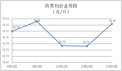 肉类商品价格微幅波动。所监测的8种肉类商品价格波动情况为4涨4跌,综合零售均价为每斤31.80元,环比上涨0.22%。其中:排骨、精瘦肉、牛肉、带骨羊肉零售均价分别为每斤30.26元、18.42元、47.07元、39.89元,环比分别下降0.03%、下降0.16%、上涨0.53%、上涨0.23%。