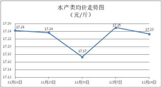 水产类商品价格窄幅盘整。所监测的水产商品价格波动情况为4涨4跌1平,综合均价为每斤17.23元,环比下降0.10%。其中:黄花鱼、草鱼、鳙鱼、基围虾零售均价分别为每斤26.33元、11.46元、10.76元、28.25元,环比分别下降0.79%、上涨0.88%、下降0.19%、上涨0.14%。
