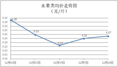 水果类商品价格总体微涨。所监测的水果商品价格波动情况为3涨1跌2平,综合零售均价为每斤6.17元,环比上涨0.19%。其中橙子、葡萄、梨零售均价分别为每斤6.20元、11.72元、5.10元,环比分别下降0.64%、上涨0.69%、持平。