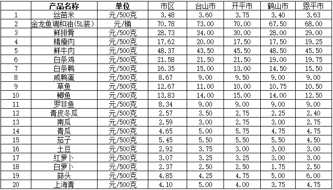 说明:1、表中价格为该地区监测点上周综合平均价;2、“市区”含蓬江区、江海区、新会区,价格分别采自蓬江市场、江南市场、城东市场等13家农贸市场;3、其他四个县市价格分别采自新华市场、锦江市场等8家农贸市场。